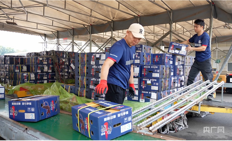 在南宁吴圩国际机场货运站,使命主说念主员将鲜榴莲卸下(央广网记者 梁瑜琳 摄)
