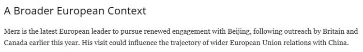 另外,从更无为的布景来看,继英国和加拿大指导东谈主本年早些时代访华之后,默茨成为最新一位访华的西方指导东谈主。而这次走访可能会影响欧盟与中国关系的走向。