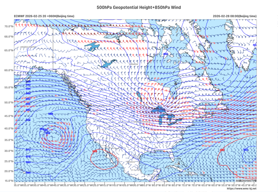 2026年2月28日08:00(北京技巧)500 hPa位势高度(单元:dagpm)和850 hPa风场(单元:m/s) 着手:宇宙征象中心(北京)
