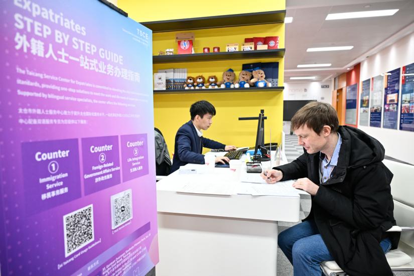 2月25日,在太仓市外籍东谈主士劳动中心,别称德企职工在办理业务。(图片开头:新华社)