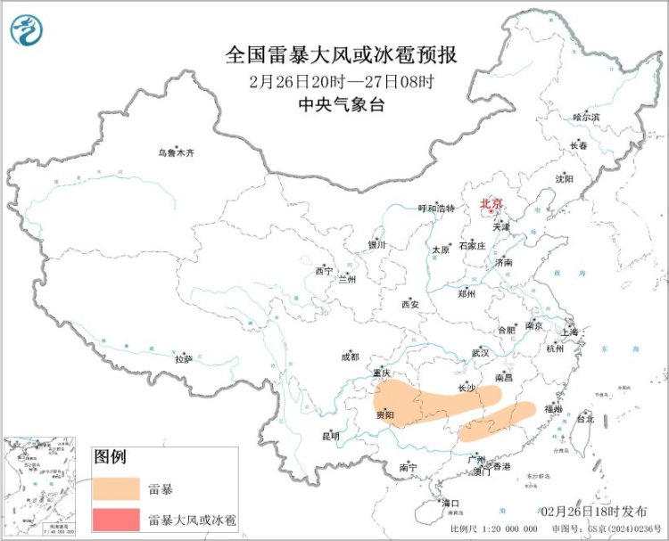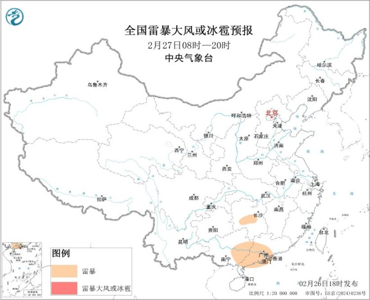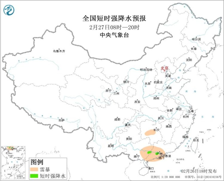 展望2月26日20时至27日20时,leyu体育湖南西南部、江西南部、福建西部、贵州东南部、广西东部、广东中部等地的部分地区将有短时强降水天气,幸运彩app小时雨量20-30毫米,局地可达30毫米以上;另外,湖南中南部、江西中南部、福建西南部、贵州中东部、广西东部、广东中西部等地的局地将有雷暴。