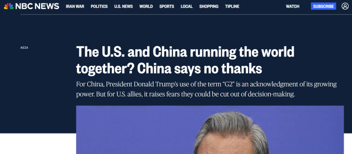 3月8日,好意思国宇宙播送公司NBC以“好意思国和中国共同掌控世界?中国说:不,谢谢”为题,撰文称中国濒临特朗普不时抛出的“G2观念”却恒久不为动摇的报谈,这篇报谈相对生僻地大篇幅援用中方对于国外事务的魄力。